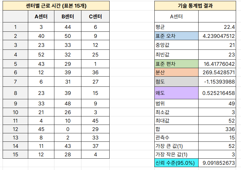 위의 사진은 엑셀의 데이터 분석 도구의 '기술 통계법'을 시행한 결과이다.