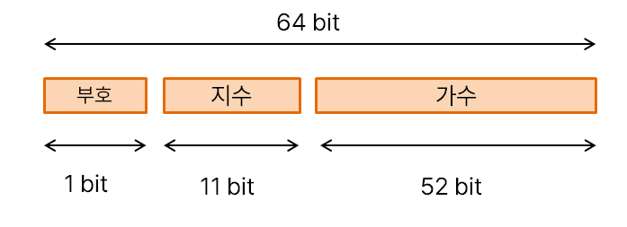 - 가수: 52bit로, 부호 + 지수 + 가수를 합쳐 총 64bit로 수를 나타낸다.