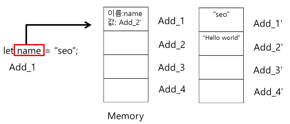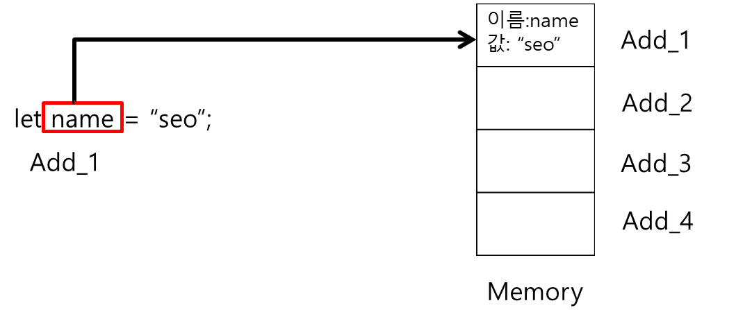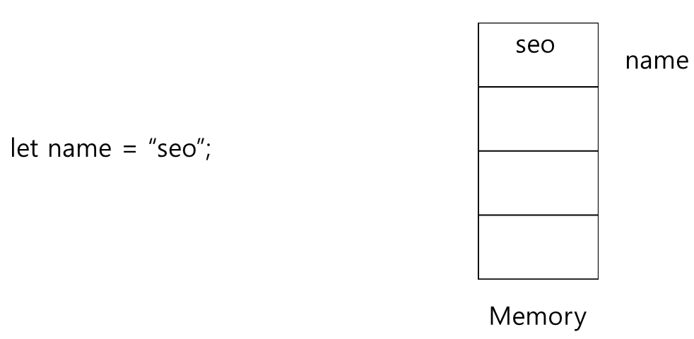 처음 변수에 대해 설명할 때 메모리에 name이라는 곳에 "seo"가 존재할 것이라 설명했다.