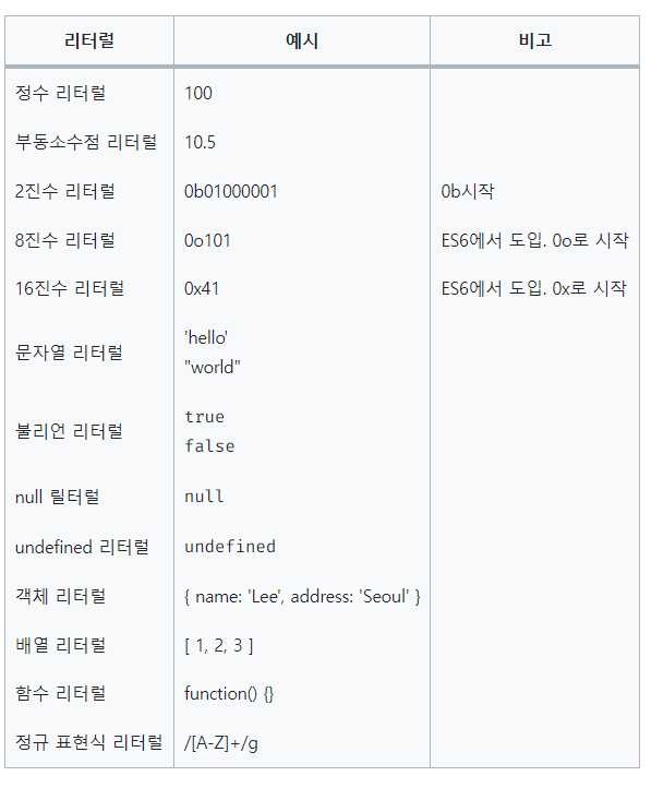 하지만 자바스크립트에서 리터럴을 자료형이라고 하기에는 무리가 있다. 리터럴은 값을 표현하는 표기법, 자료형은 데이터의 유형을 나타내는 것이다.