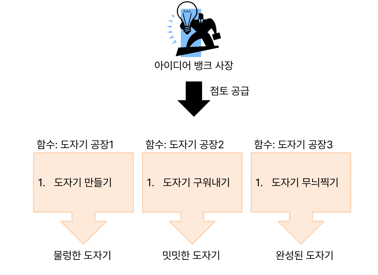 아이디어가 샘솟는 사업가가 있다. 이는 도자기를 생산해 판매할 생각이라 점토를 많이 사들였다. 대량 생산을 위해 도자기를 만들고, 굽고, 무늬를 찍어 낼 공장이 필요할 것이다. 알아봤더니, 공장이 3개가 있었다. 그런데 각 공장은 하나의 일만 할 수 있다. 3가지 일을 모두 해야 비로소 판매할 수 있는 도자기가 만들어지는데 한번에 일을 처리할 수 없어 도자기를 옮기는 과정에만 교통비가 많이 든다. 즉 비효율적이다.