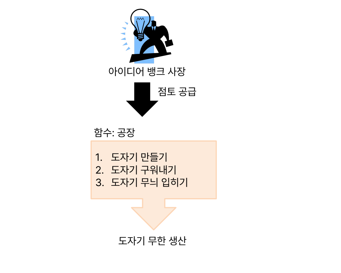 도자기의 예를 코드로 작성해봤다. 이처럼 블록문을 function 키워드, 식별자, 소괄호와 함께 묶으면 함수가 생성되는데 이를 함수를 정의한다고 한다. 함수의 종류는 2가지가 있는데 ,