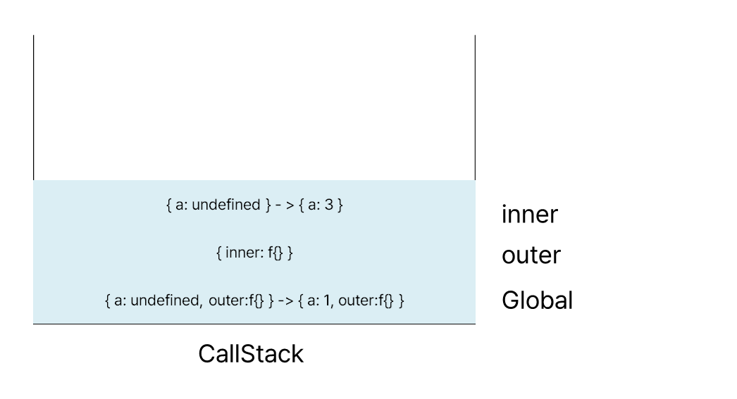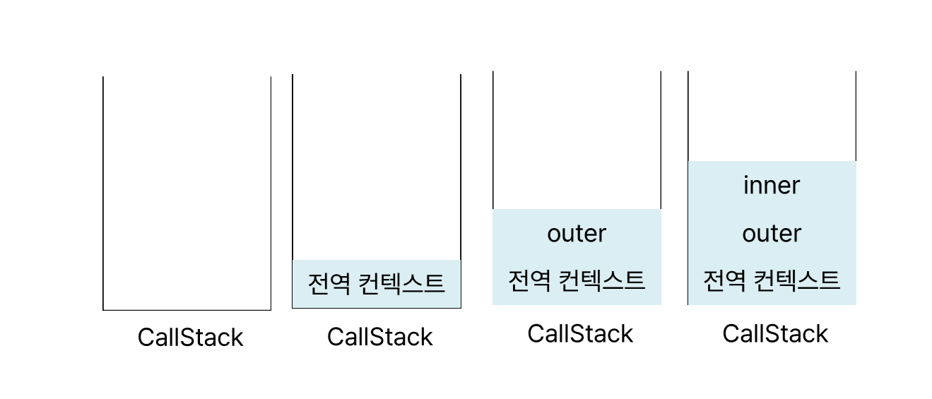 inner 함수가 호출되어 outer를 중단하고 CallStack에 inner 실행 컨텍스트를 활성화한다.