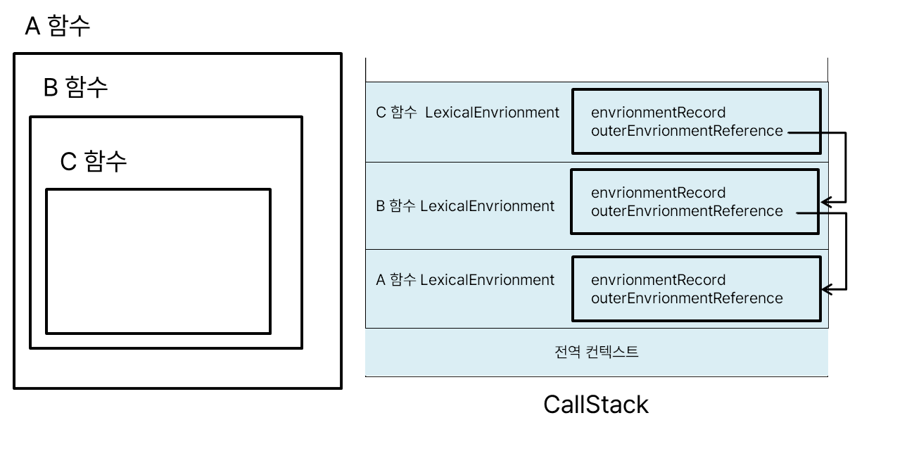 A함수 내부에 B함수, B함수 내부에 C함수를 선언한 경우, 함수 C의 outer EnvrionmentReference가 B함수의 LexicalEnvrionment를 참조한다. B함수도 마찬가지로 A함수의 LexicalEnvrionment를 참조한다. 연결 리스트 형태. 이와같이 계속 이전 함수 컨텍스트로 올라가다 보면, 마지막엔 전역 컨텍스트의 LexicalEnvrionment가 있을 것.