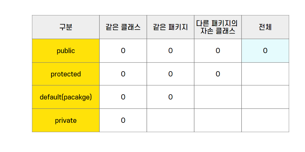 default는 접근 제한자를 지정하지 않았을 때 자동으로 부여되는 접근 제어다. 같은 패키지 내에서만 접근이 가능한 것이다. protected는 다른 패키지에 존재하는 자손(상속 받은) 클래스에서는 접근 가능하고, public은 전체에서 접근이 가능하다.