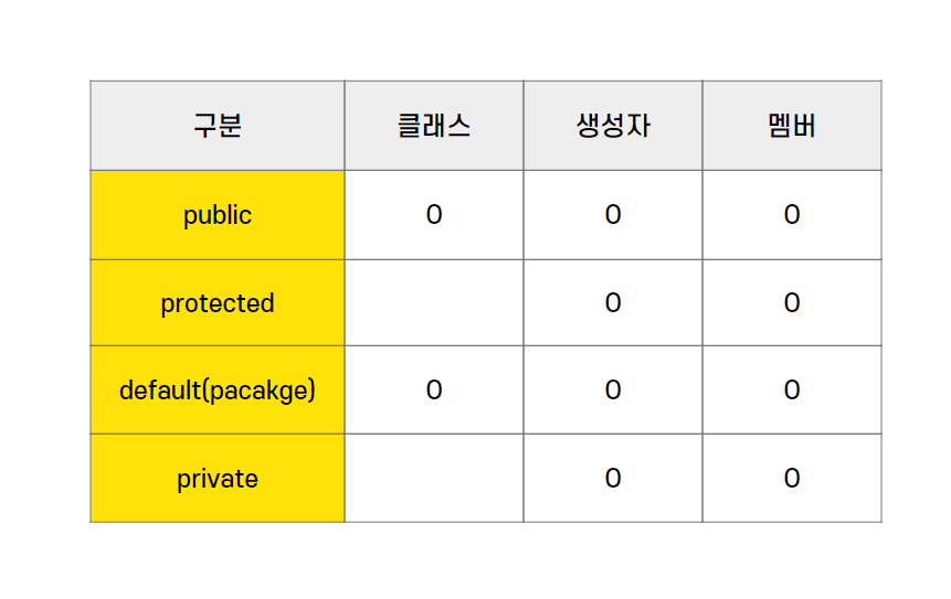 default는 접근 제한자를 지정하지 않았을 때 자동으로 부여되는 접근 제어다. 같은 패키지 내에서만 접근이 가능한 것이다. protected는 다른 패키지에 존재하는 자손(상속 받은) 클래스에서는 접근 가능하고, public은 전체에서 접근이 가능하다.