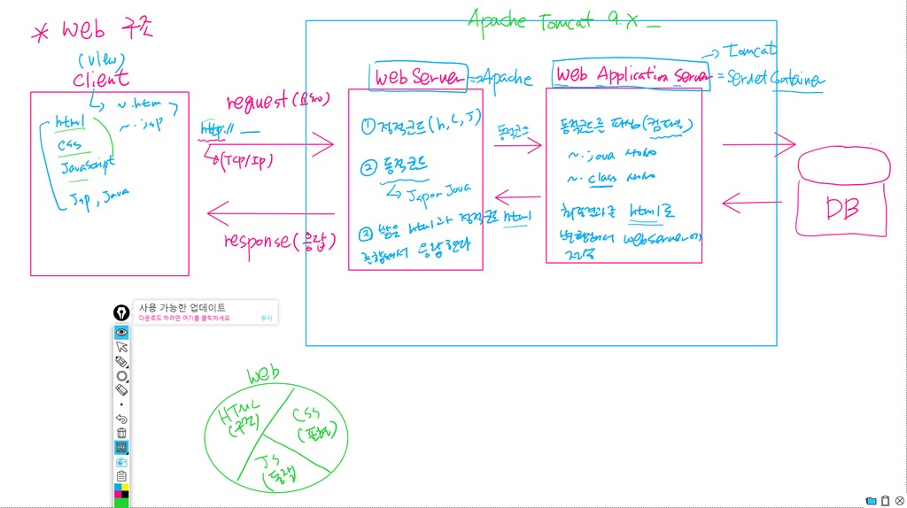 - JSP : View(jsp 문서엔에 html, css, javaScript을 그대로 코딩)