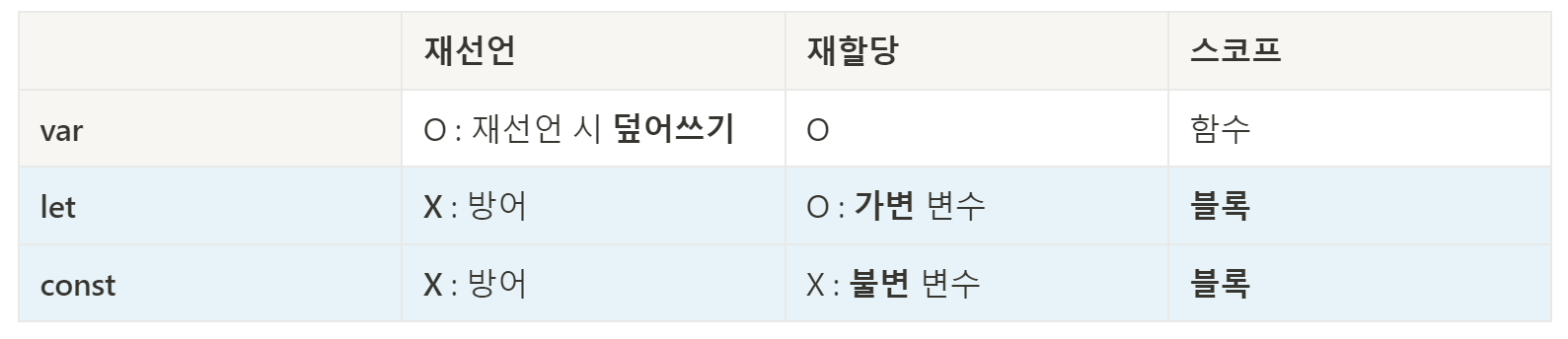 ECMSScript 6 (2015) 이전에는 var 하나의 방법으로만 선언했다. 6 이후부터 let과 const로 선언할 수 있다.