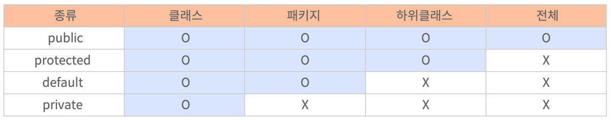 Class는 데이터와 행위(메서드)로 구성되어 있다. 클래스 내 변수에 함부로 접근했다가는 협업 할 때 문제점, 보안상의 문제가 생길 수 있다. 때문에 클래스 내 필드와 메서드 모두 접근 제어자를 통해 노출이 필요한 것만 최소한으로 외부로 노출한다.