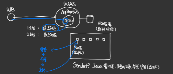 현대의 WAS는 위와 같은 그림의 구조로 설계 되었다. WAS가 Application을 내장하고, 그 내부의 각각의 단위는 프로세스가 아닌 스레드(Servlet). Spring boot로 예를 들면, Tomcat과 같은 WAS를 내장하고 있어 이를 사용할 수 있고, 사용자가 제작한 로직들은 어플리케이션이 되어 실행되는 것.