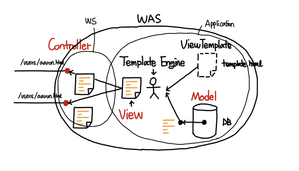 앞서 WAS의 경우 요청 -> 연산(CRUD 등) -> 반환으로 언급했다. 이를 우리는 MVC 패턴으로 만들 수 있다.