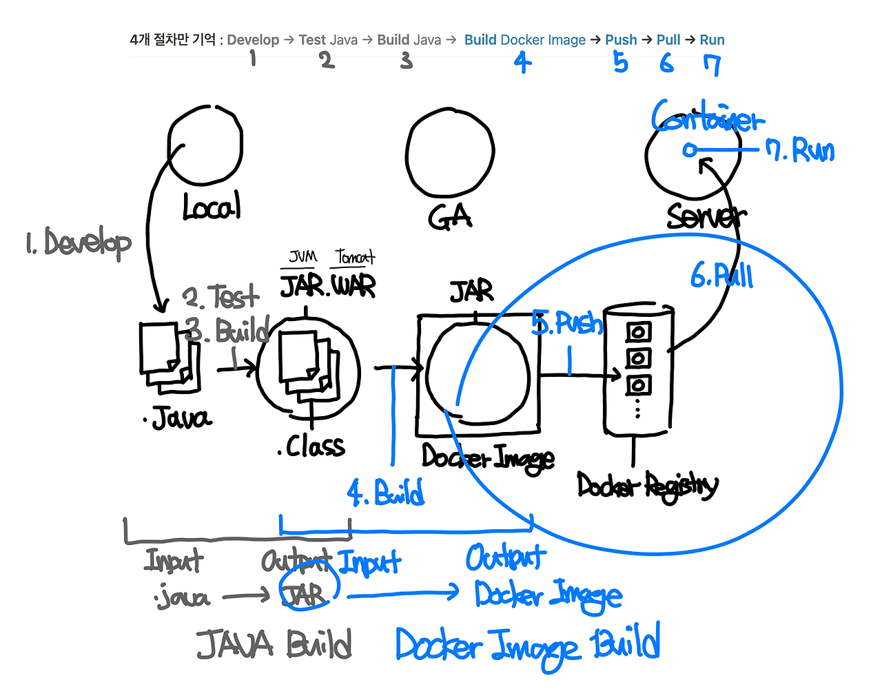 Develop -> Test Java -> Build Java -> Build Docker Image -> Push -> Pull -> Run