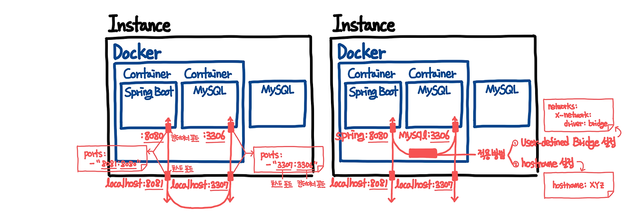 외부에서 컨테이너에 접근하는 방법은 알아봤다. 위 그림에서 오른쪽 도식처럼 Spring Boot 컨테이너가 MySQL 컨테이너로 접근하려면 어떻게 해야할까. 2가지의 방법이 있다.