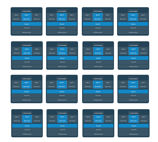 위 그림이 1개의 호스트 내 다수 N개의 컨테이너를 관리할 때의 구성이다. A, B, C의 어플리케이션이 든 컨테이너가 각각 하나의 호스트 내 올라가 있는 것을 볼 수 있다. 이는 모두 하나의 YAML 파일로 관리한다.
