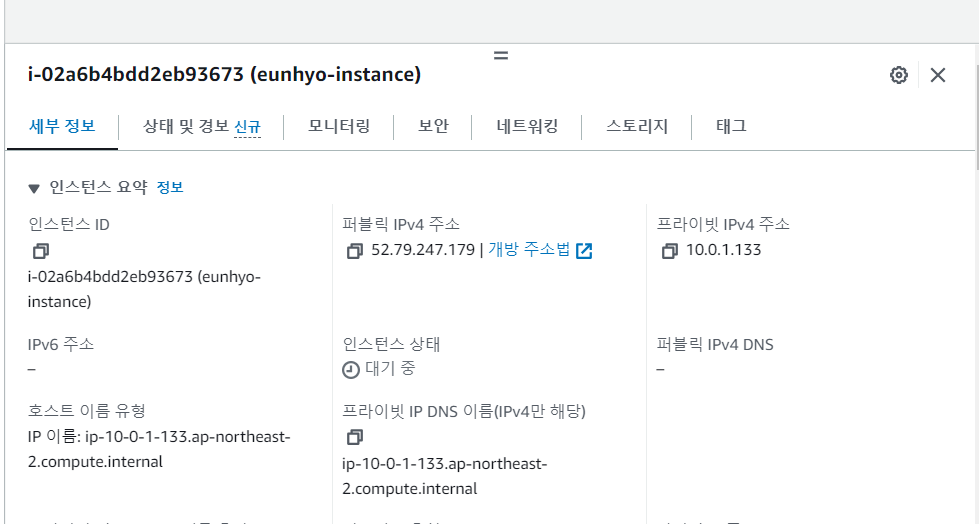 다음으로 인스턴스 하나를 생성한다. 이 때 앞서 만든 public subnet 중 하나에 할당해준다. 굳이 고정 IP를 할당해 줄 필요도 없으므로 자동 할당 퍼블릭 IP도 활성화 한다.