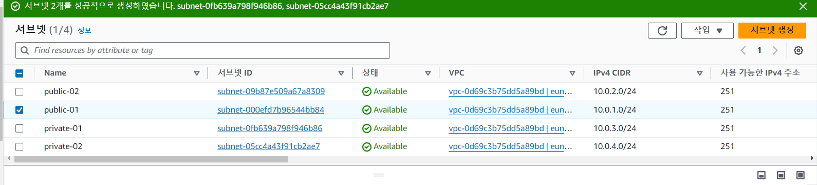그 후 subnet 4개를 만들어준다. 분명 VPC를 10.0.0.0/16로 정의했고, subnet 각각을 10.0.1.0/24 ~ 10.0.4.0/24로 정의하려 했는데 중첩된다는 이상한 오류를 내뿜었다. 중첩될 일이 없는데 대체 뭐지 싶어서 여러번 삭제했다가 생성했고 VPC도 재생성하니 subnet이 잘 만들어졌다.