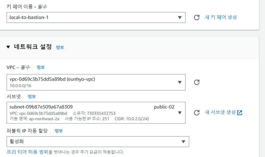 이렇게 아까 만들었던 키를 bastion 인스턴스에 적용해주고, public subnet 중 하나에 할당해준다.