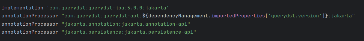 annotationProcessor "com.querydsl:querydsl-apt:${dependencyManagement.importedProperties['querydsl.version']}:jakarta"