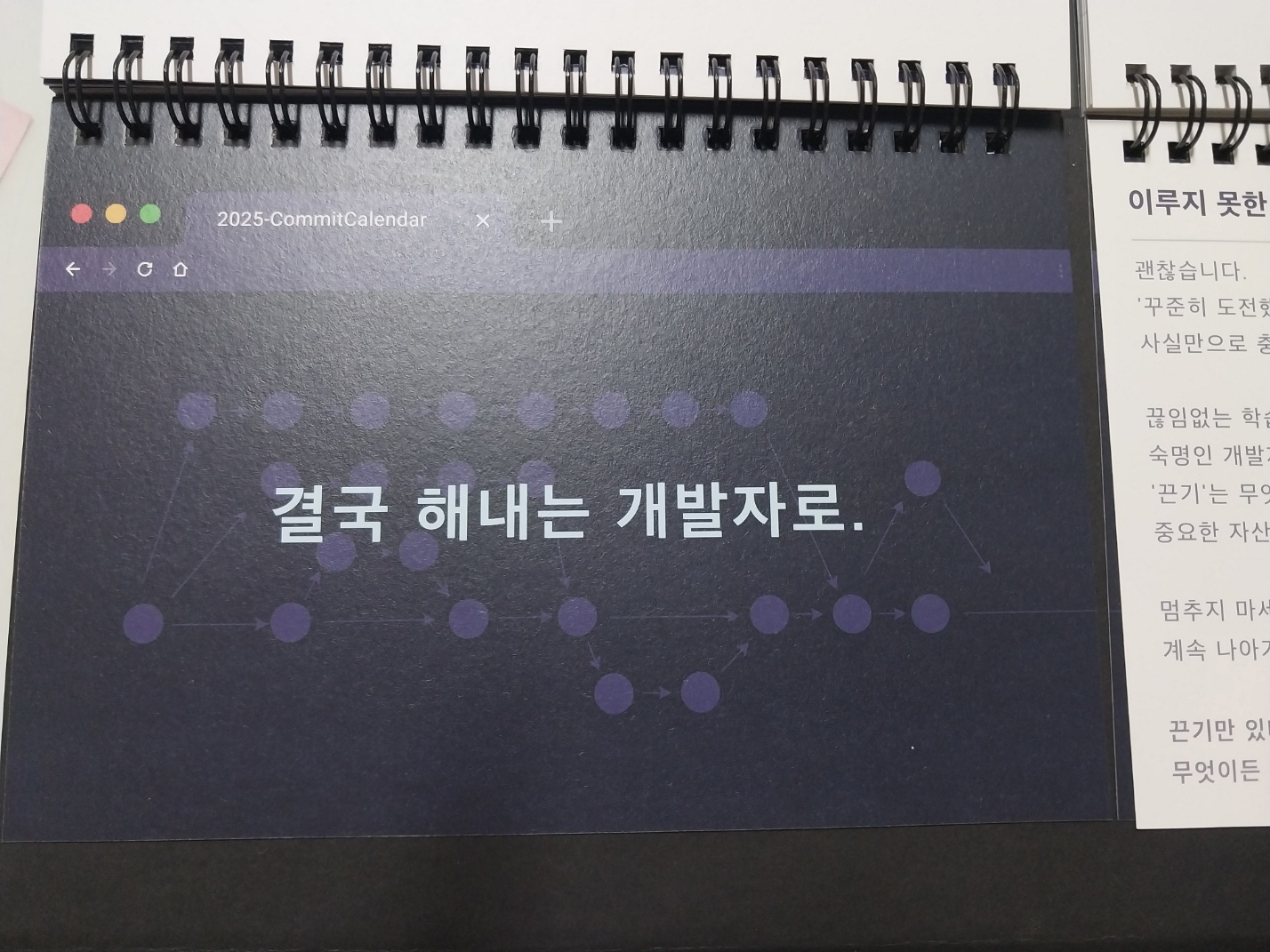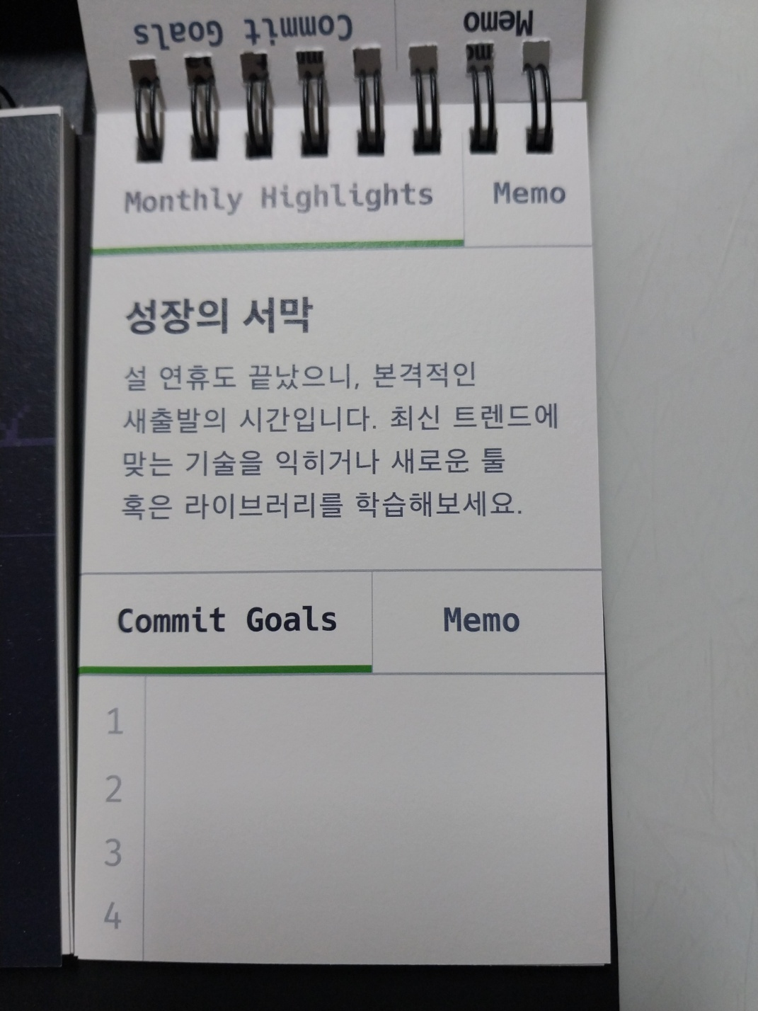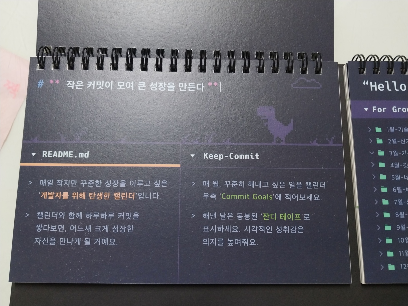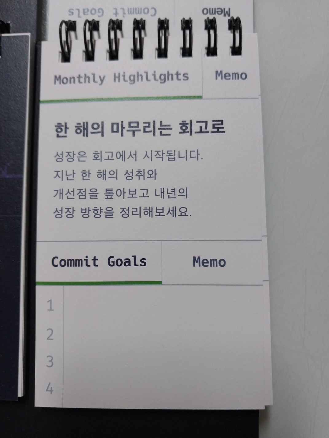 이렇게 커밋 캘린더 프리뷰를 해봤다. 캘린더 자체도 튼튼하고 재질도 좋아서 쓰기 좋다. 다만 달력 크기가 작아서 아쉬운 면이 있다. 먼슬리 하이라이트로 쪼개기 위해서 크기 자체가 좀 작아진 느낌이다.