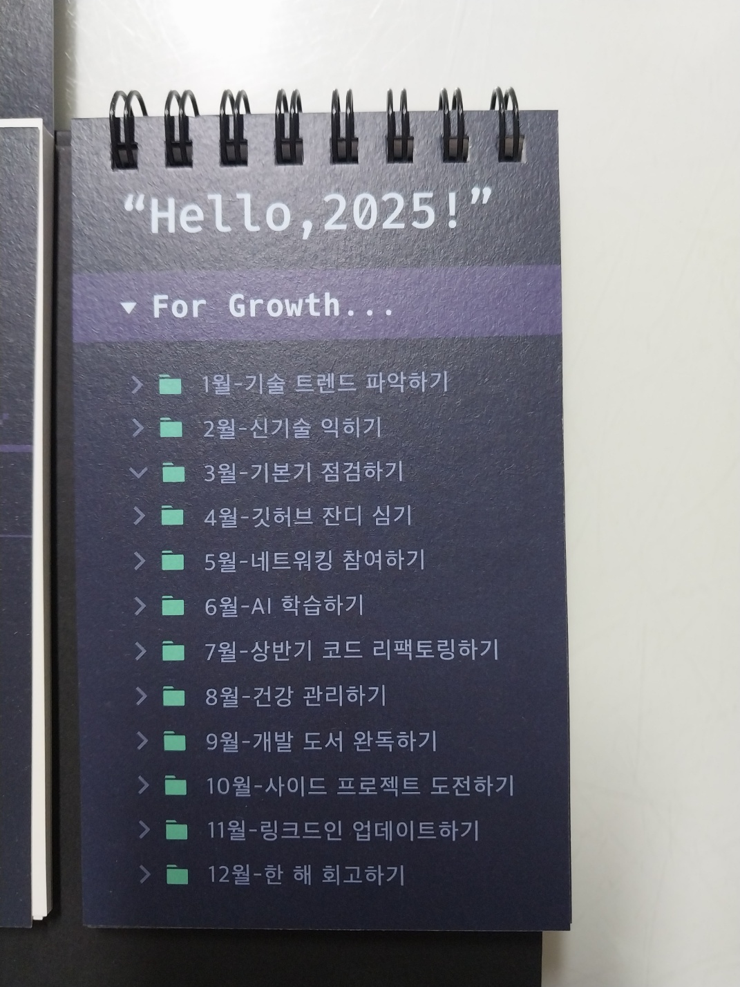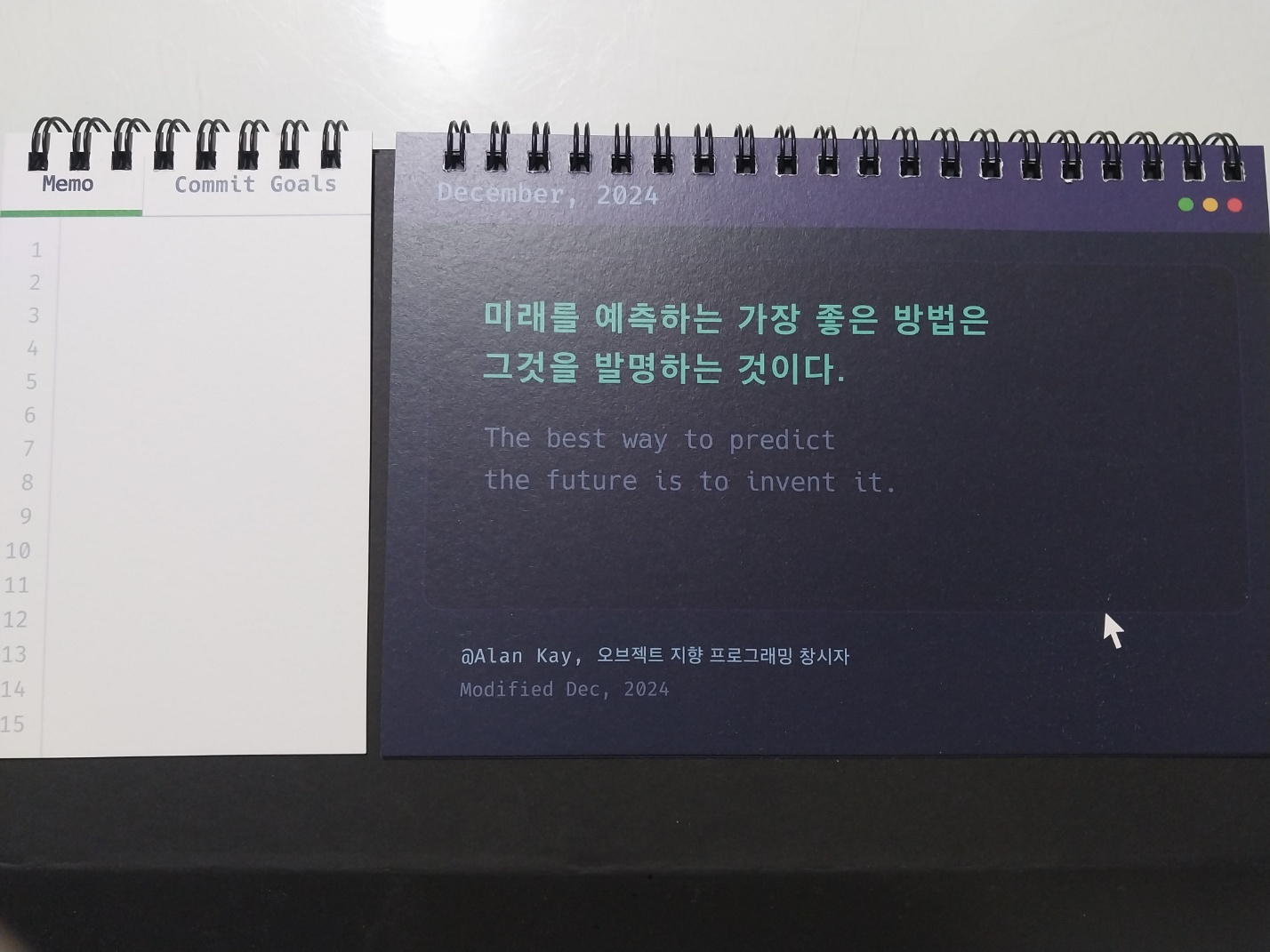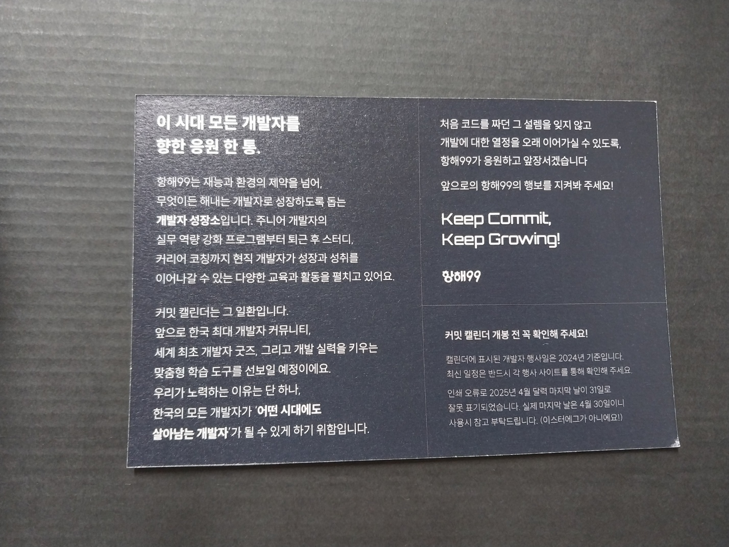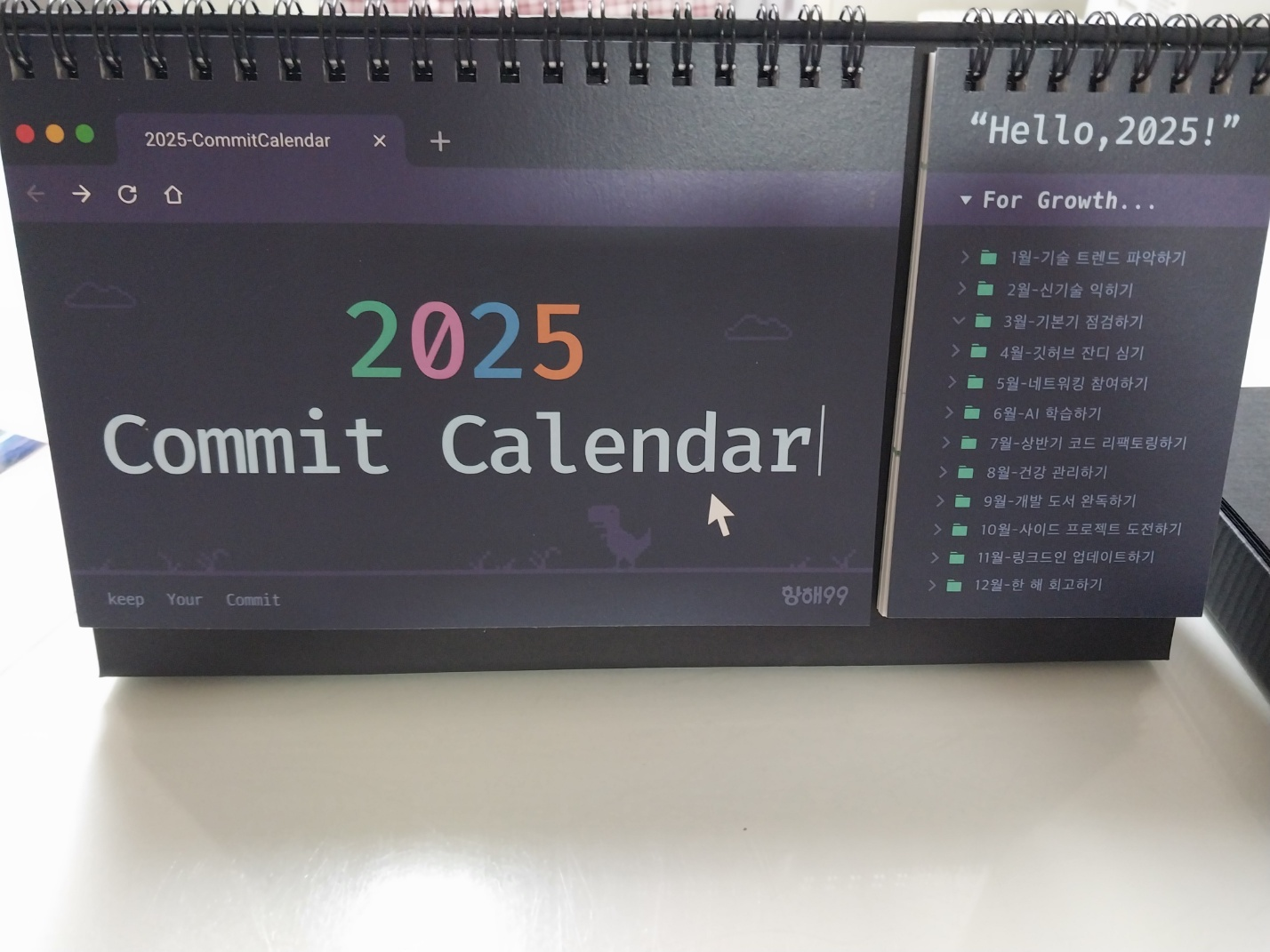 이렇게 커밋 캘린더 프리뷰를 해봤다. 캘린더 자체도 튼튼하고 재질도 좋아서 쓰기 좋다. 다만 달력 크기가 작아서 아쉬운 면이 있다. 먼슬리 하이라이트로 쪼개기 위해서 크기 자체가 좀 작아진 느낌이다.