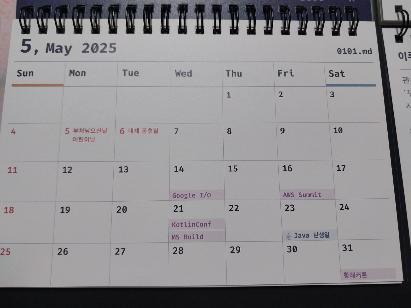 이렇게 특정 언어 탄생일이나 작년 기준 있었던 IT 행사들을 알려준다. 그리고 오른쪽 상단에, 깨알 5월을 0101로 표시해둔 게 센스있고 좋다. 귀여워..