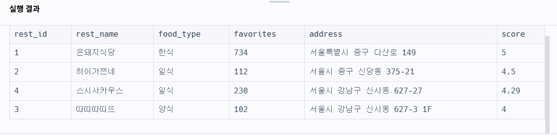 SELECT i.REST_ID, i.REST_NAME, i.FOOD_TYPE, i.FAVORITES, i.ADDRESS